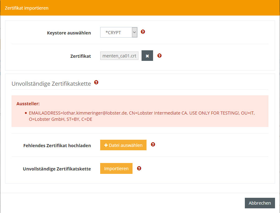 Sollte ein Zertifikat einer unvollständigen Zertifikatskette hochgeladen werden, wird auf fehlende Zertifikate hingewiesen.