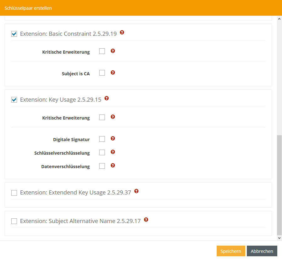 Hiermit wird ein neues Zertifikat erstellt. Neben den Aussteller Informationen können auch vier ausgewählte Erweiterungen dem Zertifikat hinzugefügt werden.