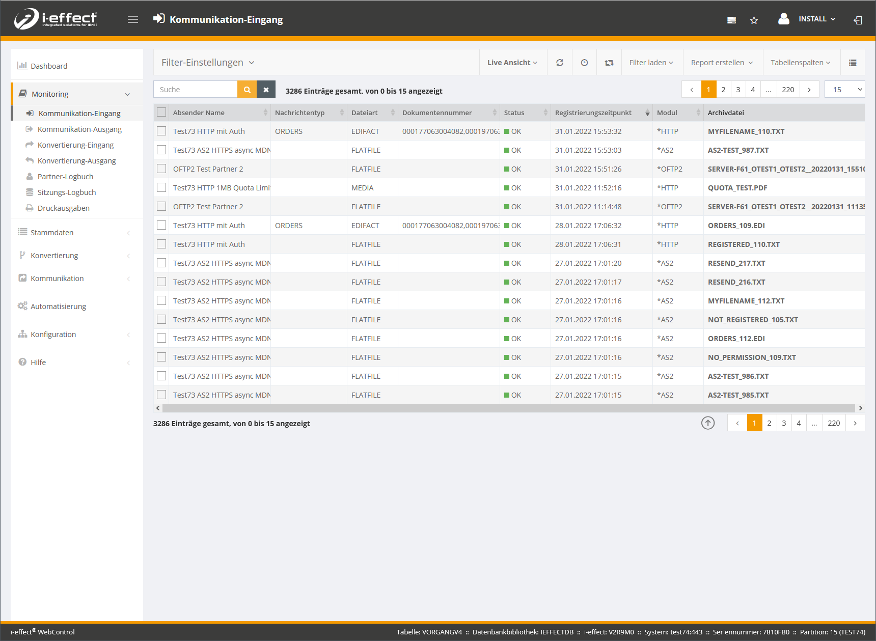 Dateien die empfangen worden sind und für die eine (negative) Empfangsbestätigung erstellt wurde stehen auf dem Status WAIT. Es wird auf den Versand der Empfangsbestätigung gewartet. Sobald die Empfangsbestätigung an den Partner übertragen wurde wechselt der Status auf OK. Falls ein Fehler auftritt, während die Datei empfangen wird oder auch während des Entpacken, Entschlüsseln und/oder der Signaturprüfung, wird der Status auf ERROR gesetzt.