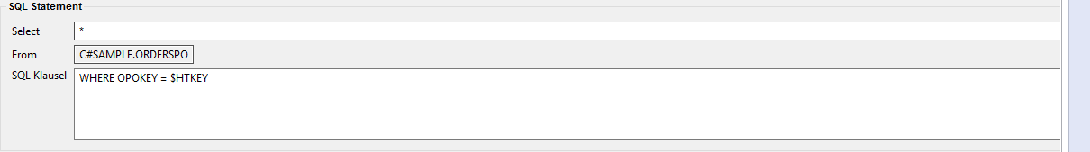 Darüber hinaus können auch die SQL-Parameter ORDER BY, GROUP BY, usw. hier mit angegeben werden. Innerhalb der Klausel ist es auch möglich, Variablen zu verwenden, die im Mapping definiert wurden (Beispiel folgt in der WHERE-Klausel der Positionsdaten).