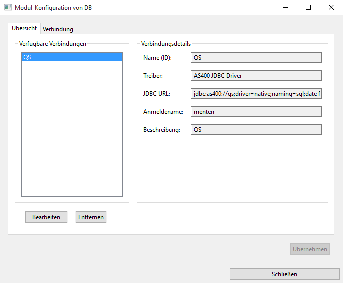 Im ersten Tab wird eine Übersicht der bereits eingerichteten Verbindungen sowie die Detailinformation der jeweiligen Verbindung angezeigt:
