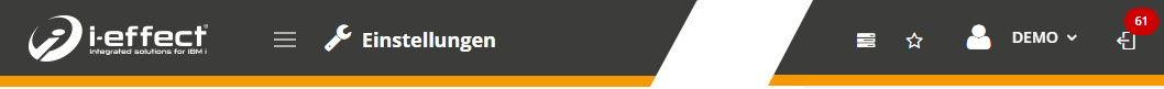 Im linken Bereich findet sich das i-effect®-Logo, das als Link zu der in den Einstellungen festgelegten Startseite dient. Die nach dem ersten Login eingestellte Startseite ist die Seite Einstellungen. Daneben ist ein Navi-Icon zum Einklappen der linken Navigation sowie der Titel der aktuell aufgerufenen Seite.