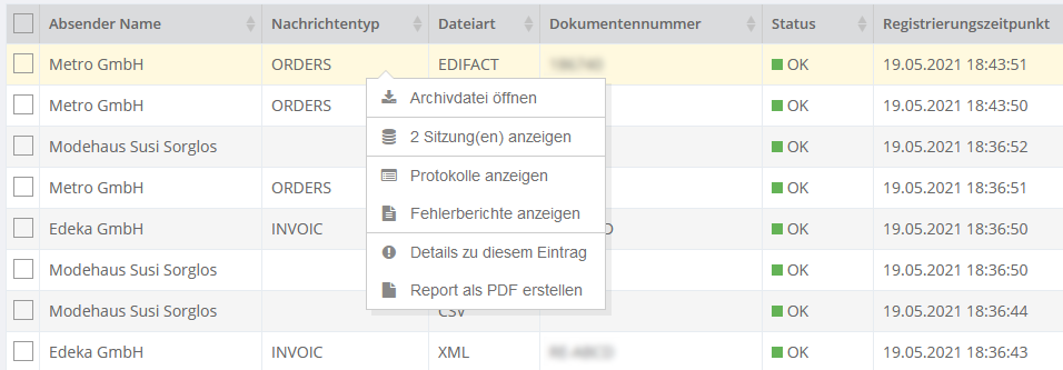 Alle mit dem Dokument verküpften Sitzungen, können über das Kontextmenü geöffnet werden. Zusätzlich können Protokolle und Fehlerberichte geöffnet werden.