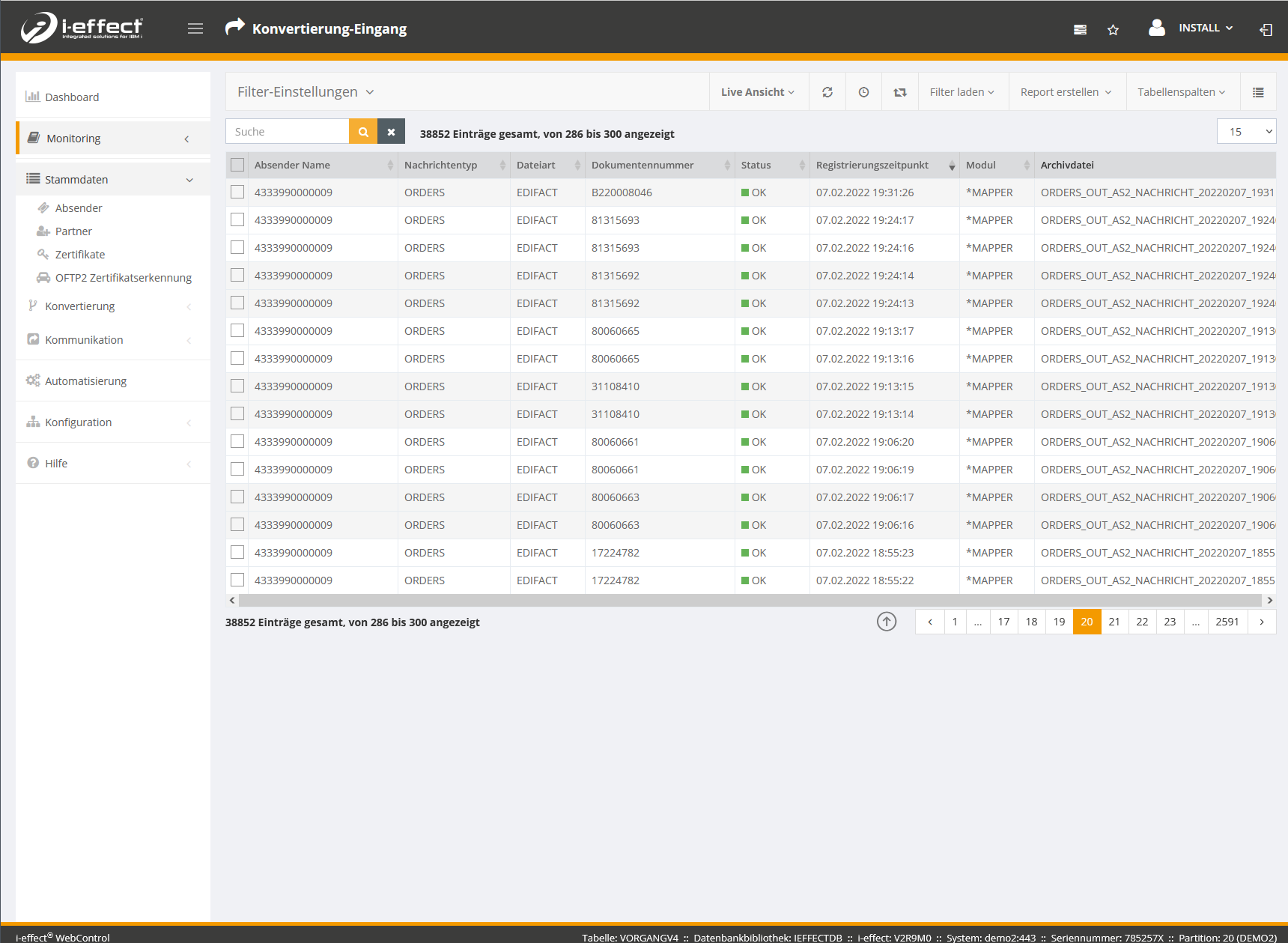 Auch in diesem Menüpunkt können jederzeit Filtereinstellungen vorgenommen werden, um die nötigen Informationen schneller zu selektieren. In den Filtereinstellungen dieser Seite kann neben dem Suche-Feld auch nach Absender und Empfänger, allen Indexbegriffen, Vorgangsnummer, Datei-ID, Sitzungsnummer, Datum und Uhrzeit für Erzeugung, Änderung, Registrierung und Archivierung, sowie nach Modulname, Status, Archiv-Status und Nachrichtentyp gefiltert werden.
