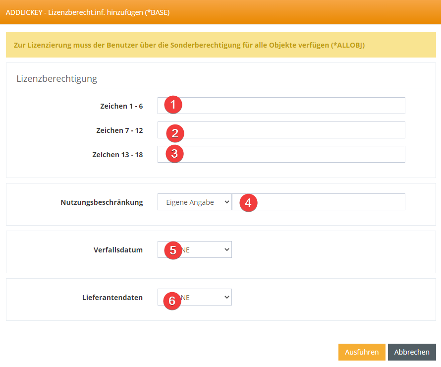 Zur Lizenzierung muss der Benutzer über die Sonderberechtigung für alle Objekte verfügen (*ALLOBJ)