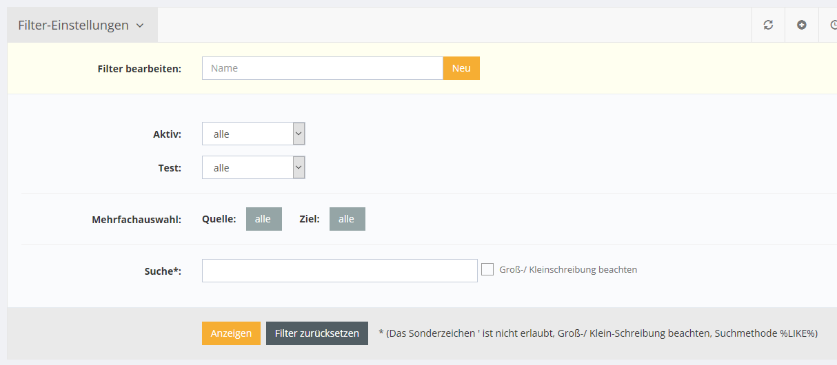 In den Filtereinstellungen kann nach Quelle- und Zielmodul, sowie nach dem Status Aktiv und Test gefiltert werden.