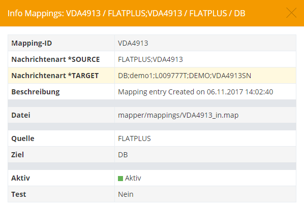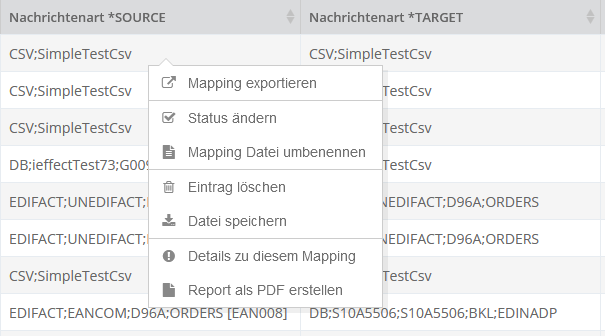 Alle im System angelegten und aktivierten Mappings werden hier in einer zentralen Verwaltungsoberfläche angezeigt. Mappings können von hier aus importiert und exportiert werden. Auch das Umbenennen von Mappingdateien und Mapping IDs wird unterstützt.