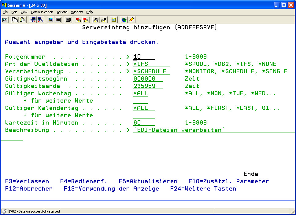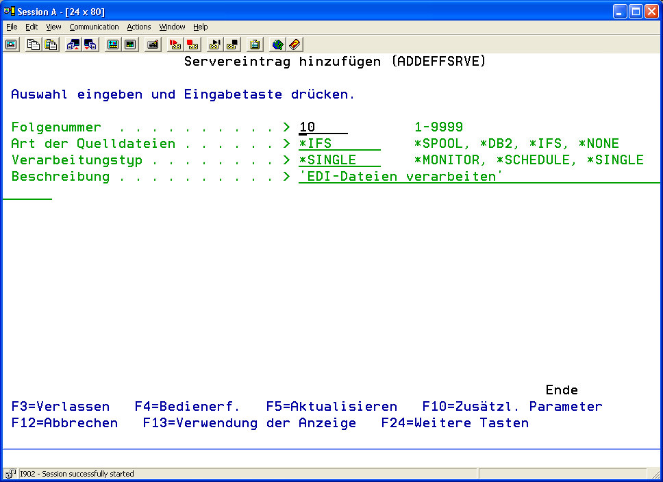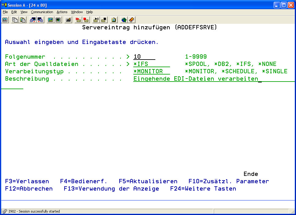 - Betätigen Sie die Funktionstaste F6 (Neuen Servereintrag hinzufügen) oder geben Sie den Befehl ADDEFFSRV ein, um einen neuen Eintrag zur Liste hinzuzufügen.