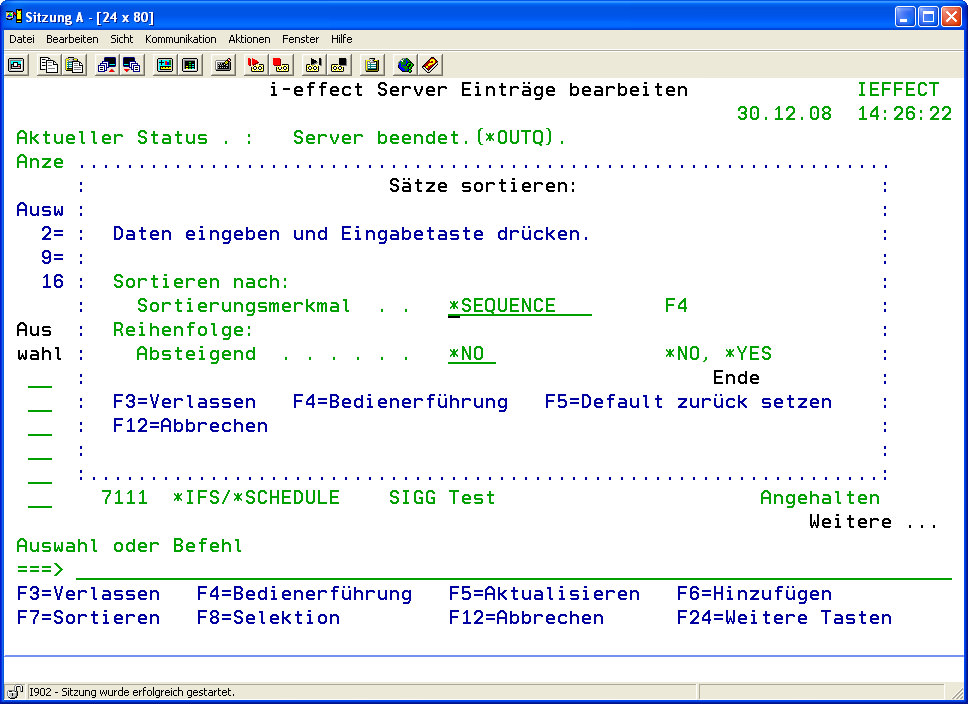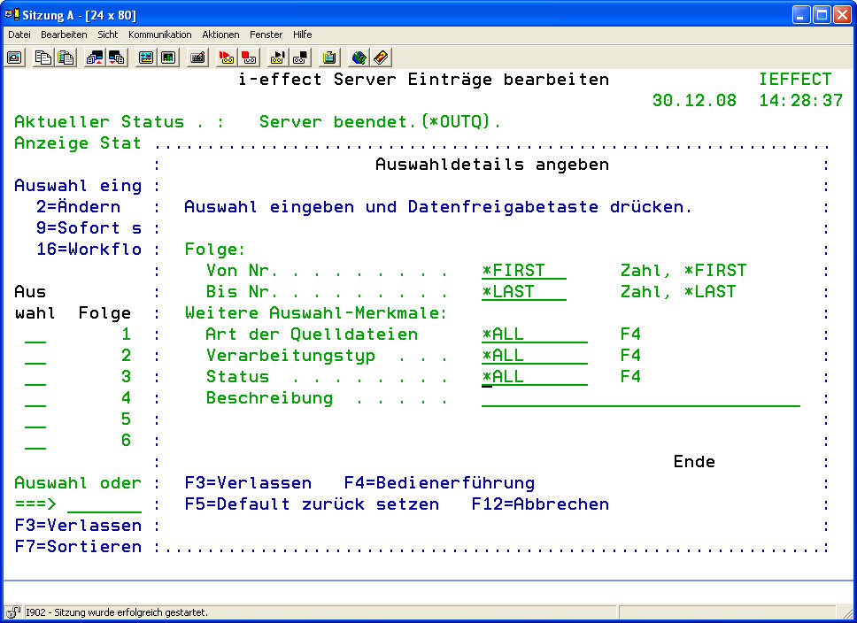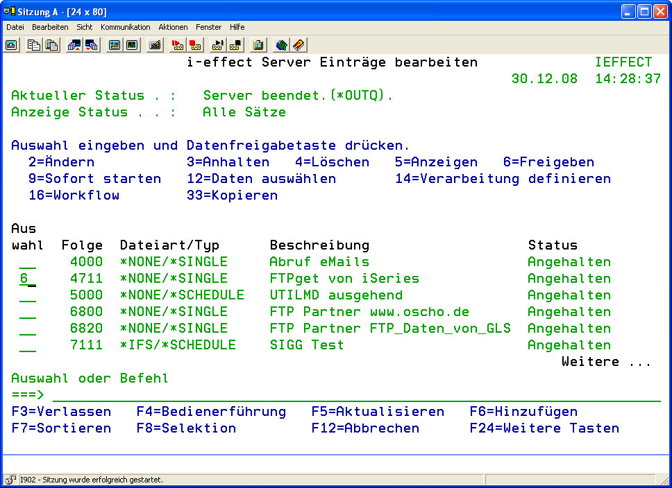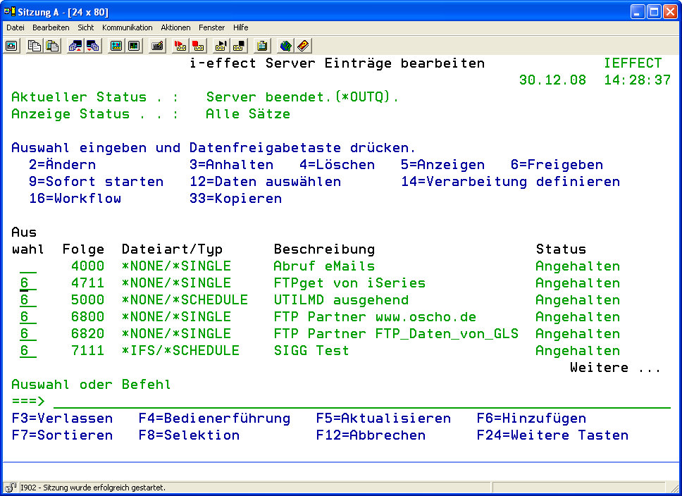 - Geben Sie über das Dialogprogramm „i-effect Server Einträge bearbeiten" die vollständige Definition aller i-effect *SERVER-Abläufe ein. Anhand der Angabe „Status" der Listeneinträge können Sie die aktuellen Serverprozessabläufe überwachen. Sie können Einträge neu anlegen, bearbeiten oder löschen.