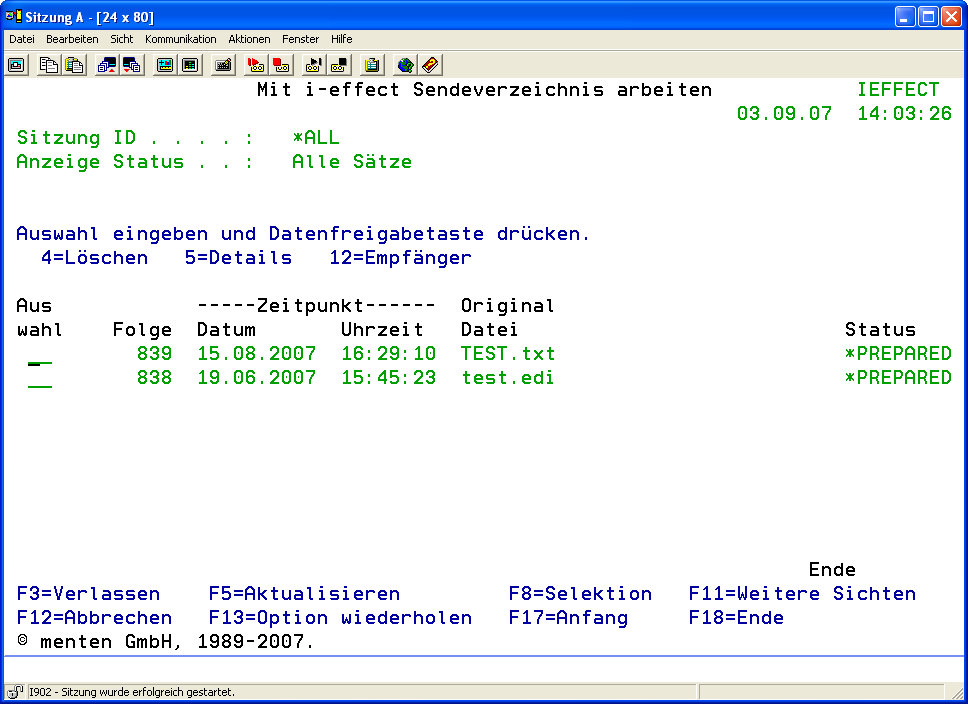 Der „Mit i-effect Sendeverzeichnis arbeiten" (WRKEFFENV)-Befehl startet die Dialoganzeige zur Verwaltung der Dateien im Sendeverzeichnis. Das Sendeverzeichnis enthält eine Auflistung der für eine Kommunikation vorbereiteten Daten und Dateien. In dieses Verzeichnis können über das Dialogprogramm Einträge hinzugefügt, geändert und gelöscht werden.