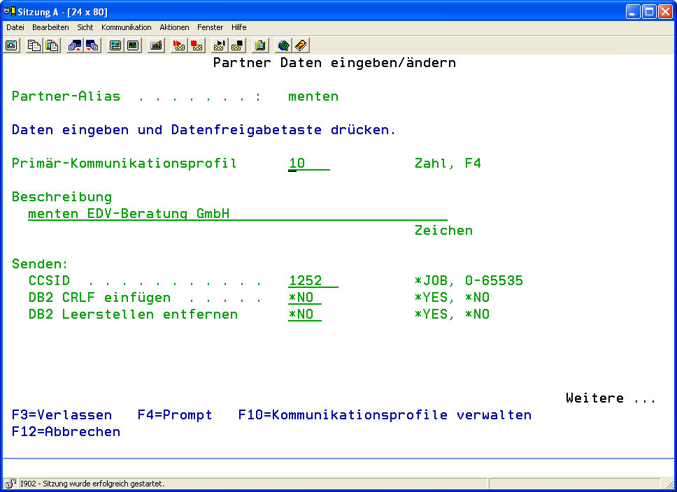 Empfänger Partner-ID (PARTNER) An dieser Stelle haben Sie die Möglichkeit, auf ein - in den Stammdaten unter Menüpunkt 50 angelegtes - Partnerprofil zu verweisen. Alle Eingaben, die dort hinterlegt sind, müssen hiernach nicht mehr definiert werden. Es stehen folgende Sonderwerte zur Verfügung: *NONE Es wird keine Empfänger Partner-ID zugeordnet. *FRMFILE Der Partner wird anhand der Empfänger GLN in der EDIFACT Datei ermittelt. Text Geben Sie die Empfänger Partner-ID an. Absender-ID (ORIGINATOR) Verweisen Sie an dieser Stelle auf ein in den Stammdaten unter Menüpunkt 51 angelegtes Absenderprofil. Betreff (SUBJECT) Der hier eingetragene Text wird als Betreff mit der Nachricht übermittelt. Dateisystem Eingabe (FS) Tragen Sie hier das Dateisystem der Eingabedatei ein.