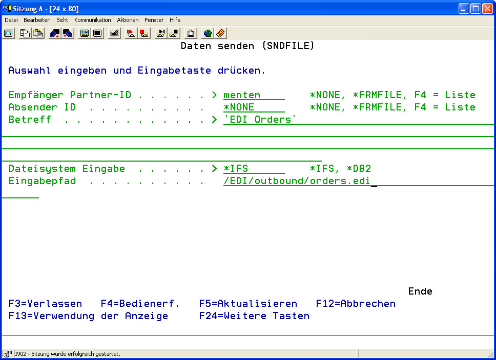 - Wählen Sie Menüpunkt 5 „EDI Daten senden" aus dem Menü „i-effect-Kommunikationsaufgaben" oder geben Sie den Befehl SNDFILE gefolgt von F4 ein.