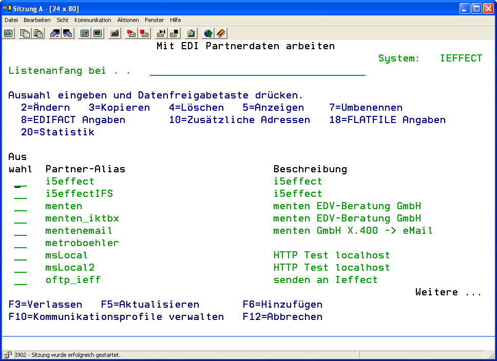 Mit Hilfe dieses Dialogprogramms verwalten Sie alle Stammdaten der Kommunikationspartner, mit denen Sie Daten austauschen möchten. Die hier vorgenommenen Einträge dienen zur Abwicklung der Datenkommunikation mit Geschäftspartnern. Rufen Sie das Dialogprogramm zur Verwaltung der Partnerstammdaten auf, indem Sie im i-effectHauptmenü die Auswahl 50 treffen.