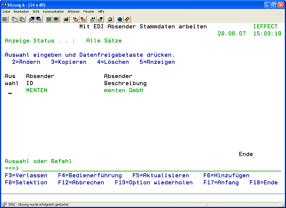 Das Anlegen von Absender Stammdaten erfolgt über das Dialogprogramm 51 „Mit EDI Absender Stammdaten arbeiten". Geben Sie hierzu die Auswahl 52 im i-effect Haupmenü ein.