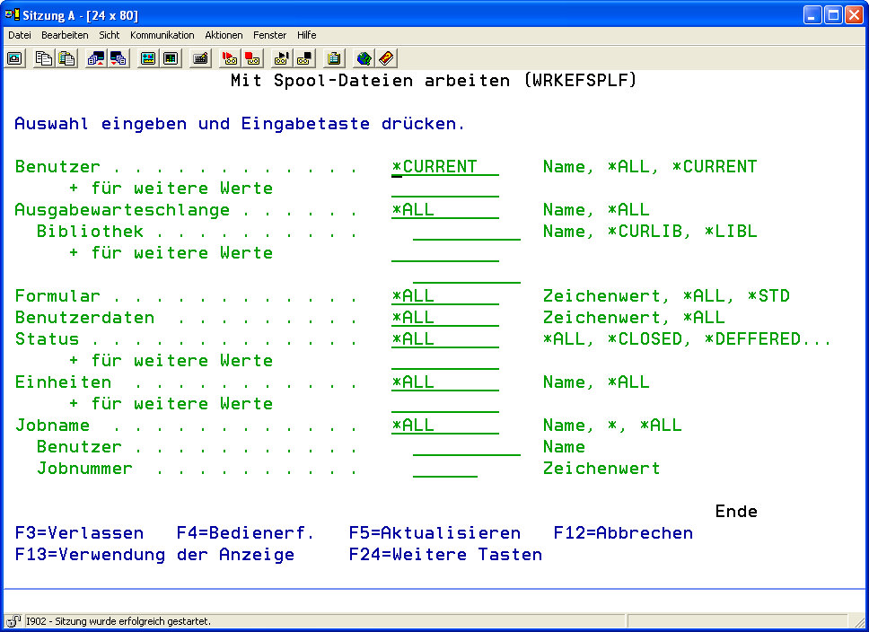 Mögliche Sonderwerte:* Berücksichtigt nur Spooldateien des aktuellen Jobs. *ALL Berücksichtigt alle Spooldateien des Systems. Benutzer Geben Sie den Namen des Spooldatei-Eigners ein. Jobnummer Geben Sie die Nummer des Jobs ein, der diese Spooldatei erstellt hat. Nach Eingabe der Parameterwerte erhalten Sie die Auswahl der gewünschten Spooldateien als Liste. Diese Liste enthält alle Attribute sowie Auswahlmöglichkeiten wie z.B. Anzeigen oder Ändern.