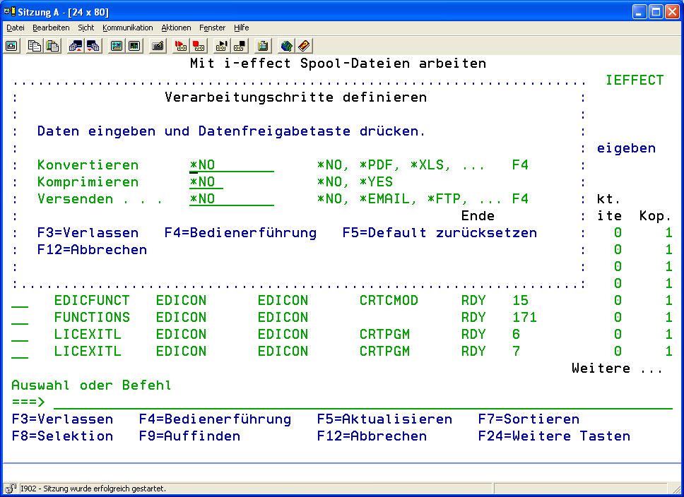 Die erhöhte Benutzerfreundlichkeit von i-effect erlaubt durch einfache Verwendung der Funktionstaste F9 den identischen Wiederaufruf von Befehlen in Dialogprogrammen, deren Parameter über die Auswahlfunktionen eingestellt wurden. Dies ist möglich, wenn in dem jeweiligen Dialogprogramm eine Befehlszeile angezeigt wird, also in den Dialogprogrammen WRKARC, WRKEFSPLF u.a.