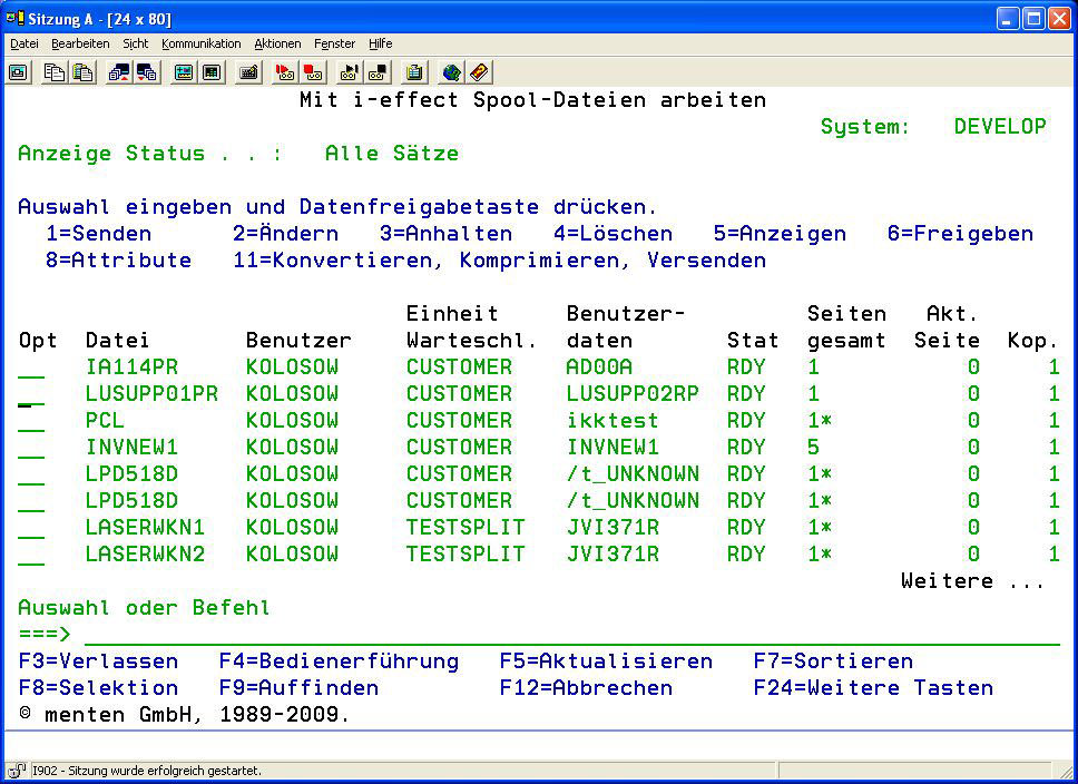 Die Funktionsweise entspricht in weiten Teilen der Systemanzeige WRKSPLF. Durch die Ergänzung um die i-effect spezifischen Funktionen wie z.B. „in ZIP-Archiv hinzufügen" oder „per eMail senden" erfüllt sie einen höheren Anwendernutzen.