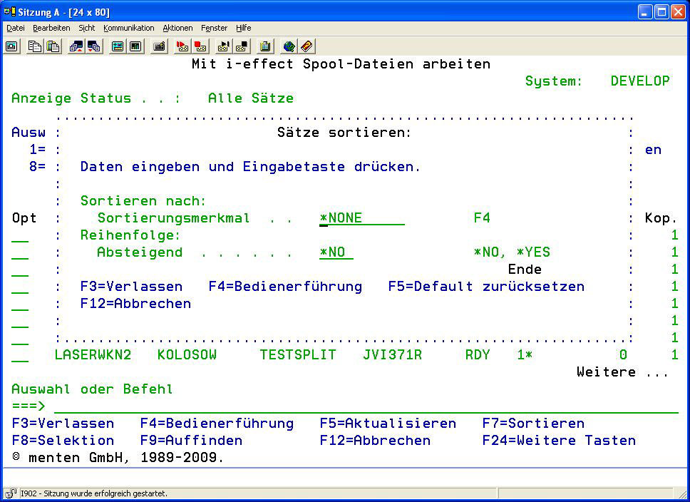 CODE*FILE, *OUTQ, *TIME, *USER, *STATUS, *SIZEindem sie mit „1" das gewünschte Sortierungsmerkmal auswählen.