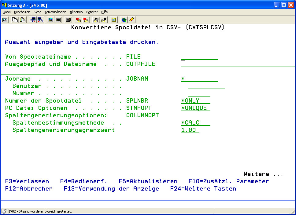 | | Unterstrich unterdrücken | Die Beschreibung dieses Parameters finden Sie unter Menüpunkt 13: Spooldatei in XLS konvertieren CVTSPLXLS. | | Spaltentrennzeichen | Wenn COLUMNOPT(*TOKEN) angegeben ist, bestimmt der gewählte Wert des Paramet die Art in der i-effect die Daten der Spooldatei in Spalten mit dem übergebenen Trennzeichen aufteilt und in die zu erzeugende Datei schreibt. Standard ist *SPLF. Dieser Befehl weist i-effect an, die Daten der Spooldatei in Spalten in der Form aufzuteilen, wie die Daten in der Spooldatei organisiert. Wurde die Spooldatei von einer fremd-beschriebenen Druckerdatei erzeugt, liefert diese Methode das beste mögliche Ergebnis, da man davon ausgehen kann, dass die Daten der Spooldatei in der Form organisiert sind, dass jedes natürlich und logische Object als separat identifizierbares Element erscheint. Wurde die Spooldatei allerdings von einer intern-beschrieben Druckerdatei erzeugt oder von einer Anwendung wie Query/400, ist davon auszugehen, dass die Daten der Spooldatei i-effect als einziger unstrukturierter Datenblock für jede Zeile des Report angereicht werden. Ist dies der Fall, werden bessere Ergebnisse durch das Festlegen eines Spaltentrennzeichen erreicht um die Aufteilung der Daten innerhalb des Reports kontrollieren zu können. Immer wenn I-effect auf das n-fache Vorkommen des aufeinander folgenden Zeichens stößt, welches als Paramter übergeben wurde, wird eine neue Spalte begonnen. n definiert dabei die Anzahl des Vorkommens dieses Trennzeichens für die Erzeugung des nächsten Elements (Anzahl der Trennzeichen). Wird beispielsweise *BLANK als Trennzeichen und 2 für die Anzahl des aufeinander folgenden Vorkommens festgelegt, erzeugt I-effect eine neue Spalte immer wenn 2 oder mehr aufeinander folgende Leerzeichen in der Spooldatei gefunden werden. Erkennt i-effect, dass die Spooldatei basierend auf einer Datei ohne DDS oder als Ausgabe einer Query/400 Anfrage erzeugt wurde, verwendet i-effect automatisch das Äquivalent von *BLANK als Spaltentrennzeichen und 2 für die Anzahl der Trennzeichen (siehe unten). *SPLF | Aufteilt die Daten des Report basierend auf der intern Organisation der Daten innerhalb der Datei. | *BLANK | Das Trennzeichen ist das Leerzeichen. | | character-value | Das zu verwendende Trennzeichen um einen Spaltenabschluss zu erkennen. |