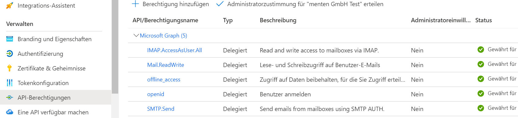 API-Berechtigungen wie folgt setzen und Administratorzustimmung erteilen.
