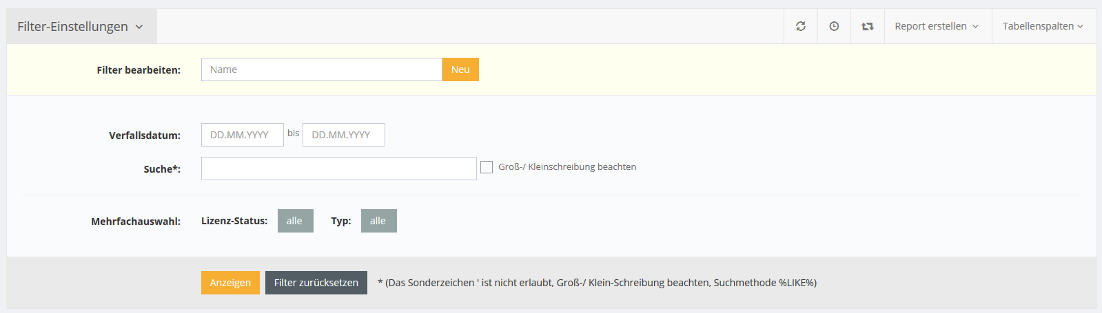 In den Filtereinstellungen kann neben dem Suche-Feld nach dem Verfallsdatum sowie dem Lizenz-Status und Typ gefiltert werden.