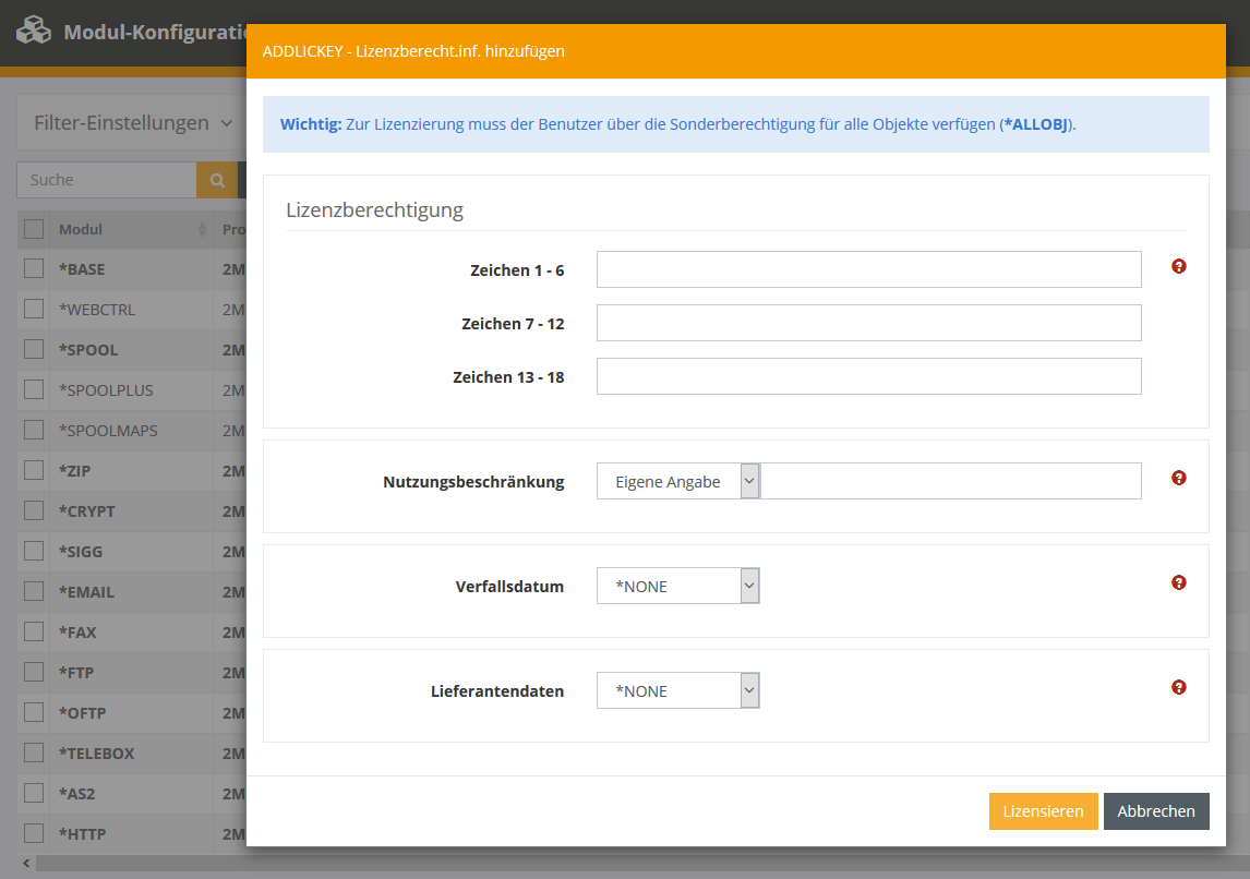 Zum Einspielen einer Lizenz muss der Benutzer über die Sonderberechtigung für alle Objekte (*ALLOBJ) verfügen.
