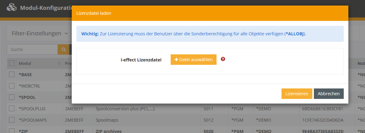 Es wird eine Lizenzdatei hochgeladen, die auf Gültigkeit überprüft wird. Die Lizenzen werden direkt den entsprechenden Modulen zugeordnet.