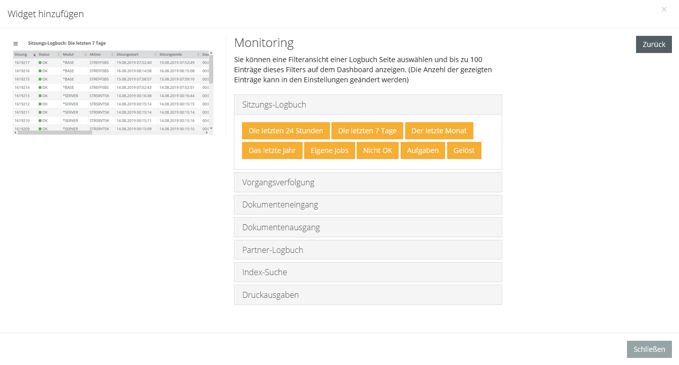 Ab i-effect 2.8 können aus der Rubrik Monitoring Tabellen auf dem Dashboard angezeigt werden. Dazu wird eine Filteransicht einer Logbuch Seite ausgewählt und mit bis zu 100 Einträgen Filters auf dem Dashboard anzeigt. . Zur Auswahl stehen sowohl die vordefinierten Systemfilter, als auch die von jedem User für sich selber gespeicherten Filter.