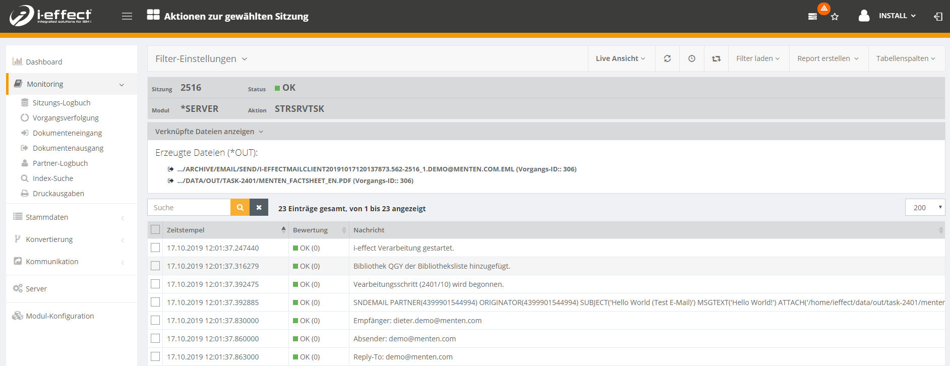 In den Details sehen Sie die verarbeiteten bzw. empfangenen Dateien sowie das Sitzungslogbuch.