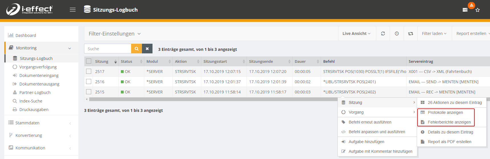 Öffnen Sie hierfür Monitoring → Sitzungs-Logbuch und öffnen Sie das Kontextmenü des entsprechenden Eintrags. Dort können Sie zwischen den Protokollen und den Fehlerberichten auswählen.