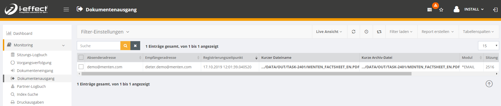 Im Dokumentenausgang (Monitoring → Dokumentenausgang) sehen Sie die mithilfe des SNDEMAIL-Befehls versendeten E-Mails.