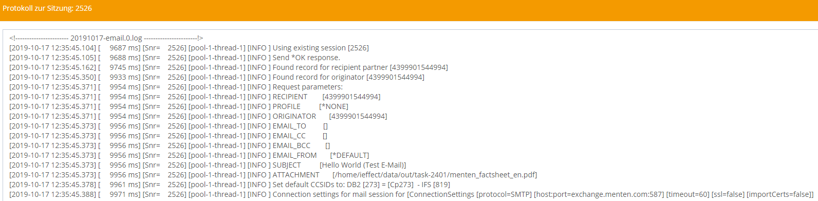 Sie können detaillierte Informationen zu einer Sitzung erhalten in dem Sie sich das Internal-Log des E-Mailmoduls ansehen. Sie können das Log entweder über Webcontrol oder im Dateisystem selbst ansehen. Es empfiehlt sich die Verwendung von Webcontrol, da Webcontrol die Logs aller Module zu einer bestimmten Sitzung für Sie zusammenstellt.