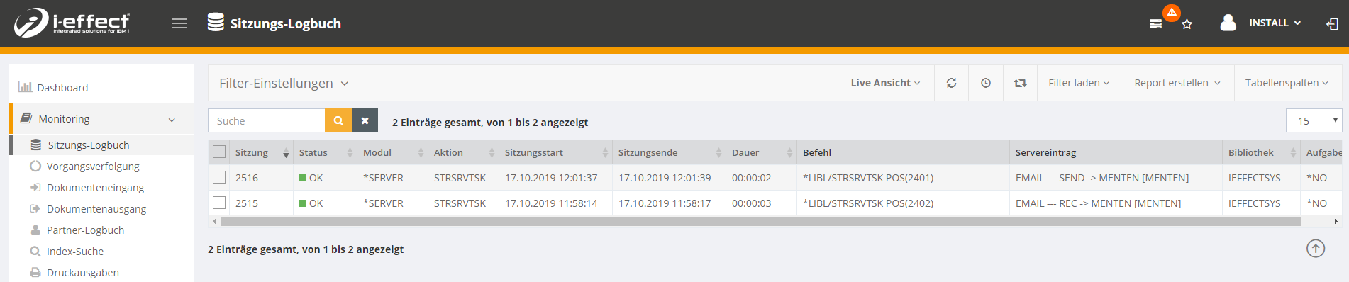 Die Befehlsaufrufe werden selbstverständlich auch im Sitzungs-Logbuch angezeigt.