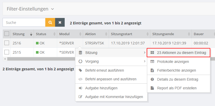 Sie können sich auch die Details der Sitzung anzeigen lassen. Öffnen Sie dazu das Kontextmenü des jeweiligen Eintrags → Sitzung → Aktionen zu diesem Eintrag.