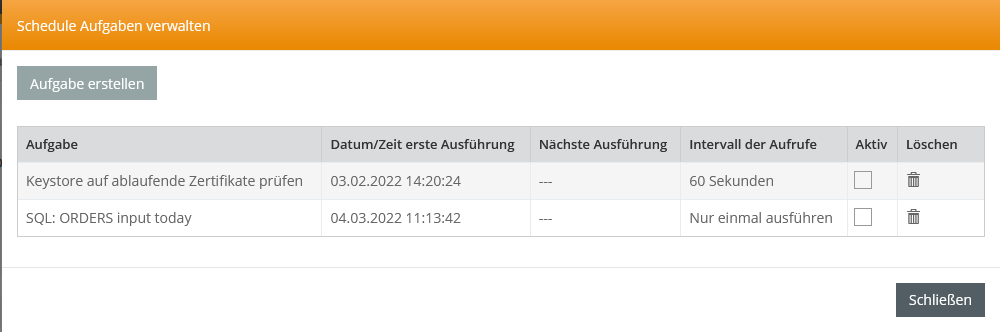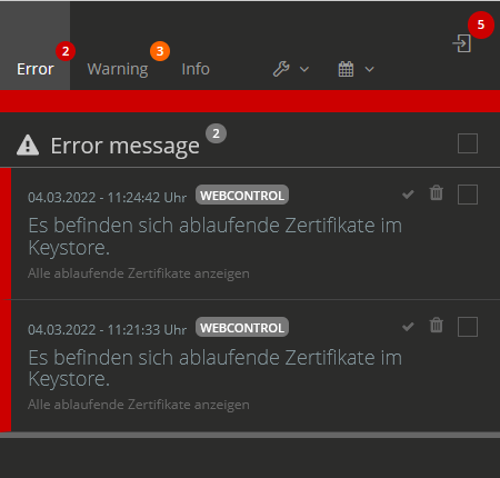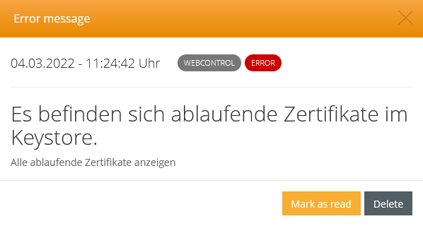 Mit einem Klick auf die Benachrichtigung wird diese als Pop-up geöffnet. Je nach Typ können von hier aus weitere Seiten (z.B. Keystore) mit zugehörigen Informationen aufgerufen werden.