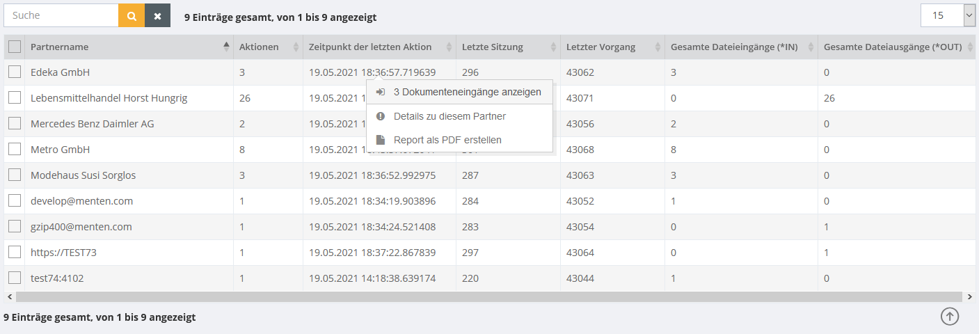 Über das Kontextmenü (Rechtsklick auf eine Zeile) lassen sich auch in dieser Rubrik neben den Detailinfos die Kommunikations Ein- und Ausgänge zum Partner aufrufen.