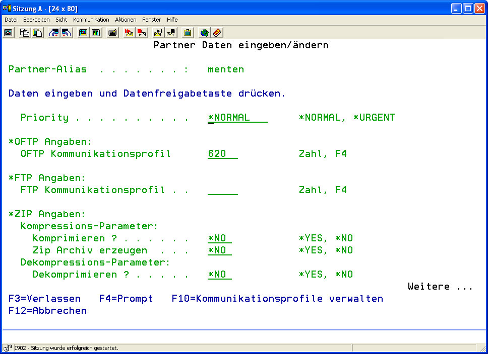 | Kommunikationsprofil | Um Daten einem i-effect Profil zuzuordnen, (und damit zu dem FTP-Partner zu dem eine Verbindung aufzubauen ist) ist hier die Nummer des i-effect Profils einzutragen, das diesen entfernten FTP-Server beschreibt. Mit der Funktionstaste F4 kann eine Liste der bereits im System definierten Profil zur Auswahl angezeigt werden. |