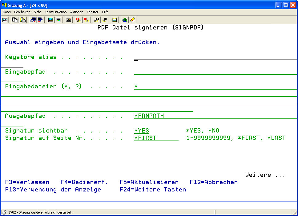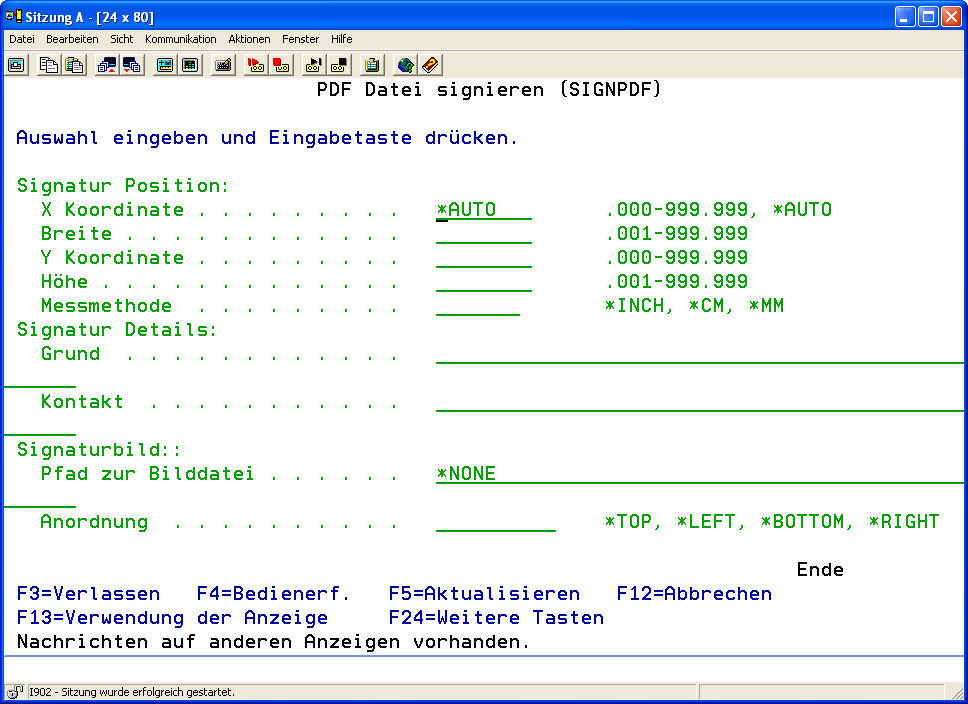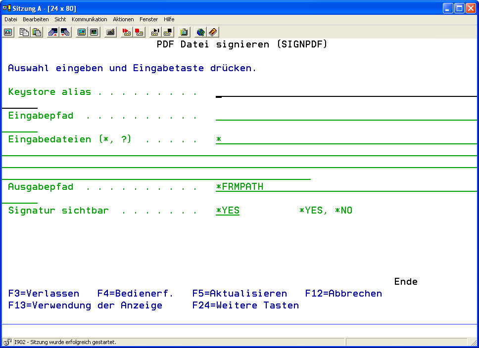 Alternativ dazu können Sie auch direkt im i-effect Menü den Befehl „SIGNPDF" gefolgt von F4 eingeben.