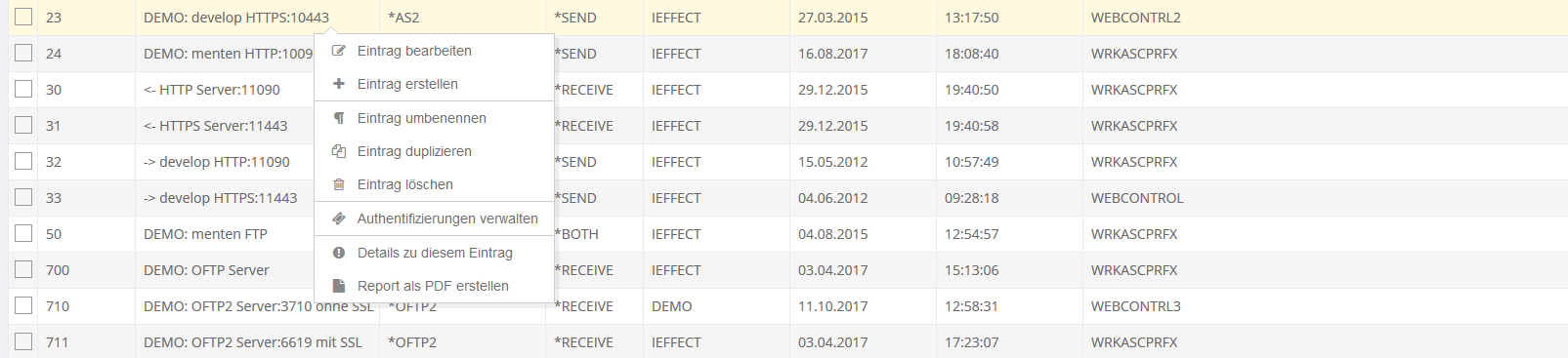 Öffnen Sie das Kontextmenü können Sie mithilfe dieses Punktes die Authentifizierungen zu einem Profil verwalten. Diese Option gibt es nur für die Module *HTTP und *AS2 mit der Kommunikationsrichtung *SEND.