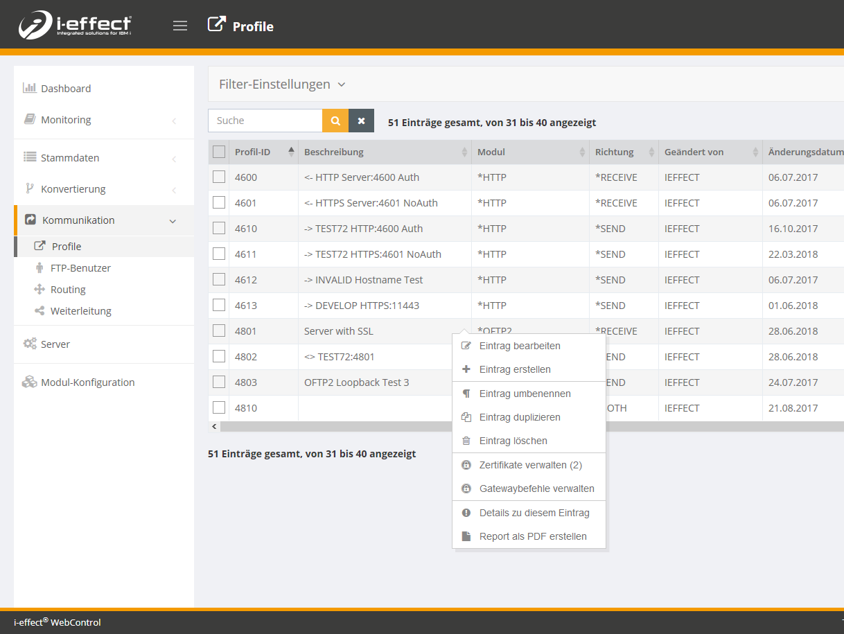 In dieser Rubrik werden die Kommunikationsprofile verwaltet. Der Bearbeiten Dialog ist dynamisch aufgebaut und zeigt beim Anlegen eines Profils je nach ausgewähltem Modul und der Richtung der Kommunikation andere Einstellungen an.