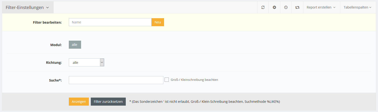 In den Filtereinstellungen kann neben dem Suche-Feld nach der Kommunikationsrichtung und dem zugehörigen Modul gefiltert werden.