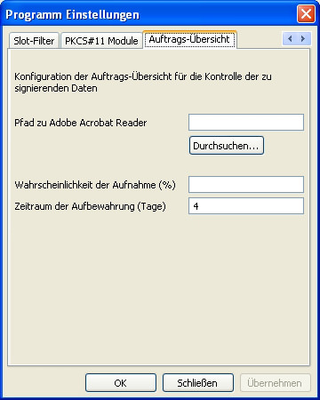 | Wahrscheinlichkeit der Aufnahme (%) | An i-effect *SIGG übergebene Aufträge werden mit der eingestellten Wahrscheinlichkeit in die Auftrags-Übersicht aufgenommen. Die Notwendigkeit des Führens der Auftrags-Übersicht ergibt sich aus den Anforderungen des Signaturgesetzes, die eine Überprüfung von zu signierenden Daten vorschreibt. Die Überprüfung soll ermöglichen, dass fehlerhaft übermittelte oder manipulierte Daten erkannt werden können. Es können Werte zwischen 5 und 100 % eingetragen werden. |