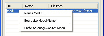 Durch Klicken der rechten Maustaste in die Modul-Tabelle ist es möglich Module neu hinzuzufügen, einzelne Module zu löschen oder den Modul-Namen eines bereits existierenden Moduls zu bearbeiten.