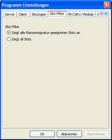 | Zeigt alle massensignatur-geeigneten Slots an | Nur Slots, die die Fähigkeit für die Durchführung von Massensignaturen besitzen, werden in der Übersicht verfügbarer Slots angezeigt. |