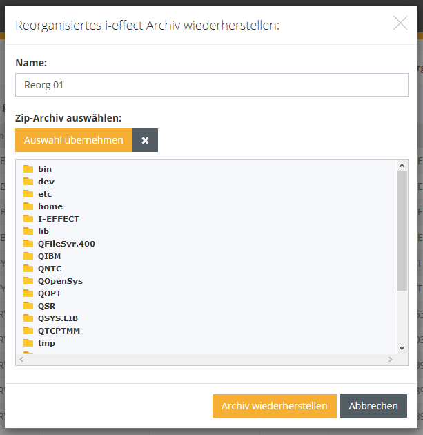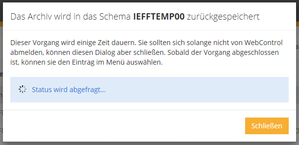 Maximal können 100 Archive zurückgespeichsert werden, welche dann für alle WebControl Benutzer zugänglich sind. Beim zurückspeichern werden dabei automatisch neue Biblotheken im Namensschema IEFFTEMP00 - IEFFTEMP99 angelegt.