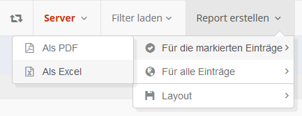 In der Menü-Leiste können Reports für eine Auswahl an Datensätzen erstellt werden. Der Report kann entweder von einer per Checkbox ausgewählten Gruppe von Einträgen erstellt werden, oder von allen Einträgen die zum Beispiel durch einen Filter ausgewählt sind.