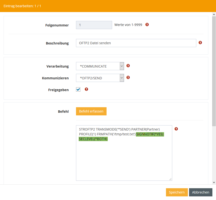 Um die gesicherte Übertragung zu realisieren ergänzen Sie den Befehl STROFTP2 mit den Befehlen: