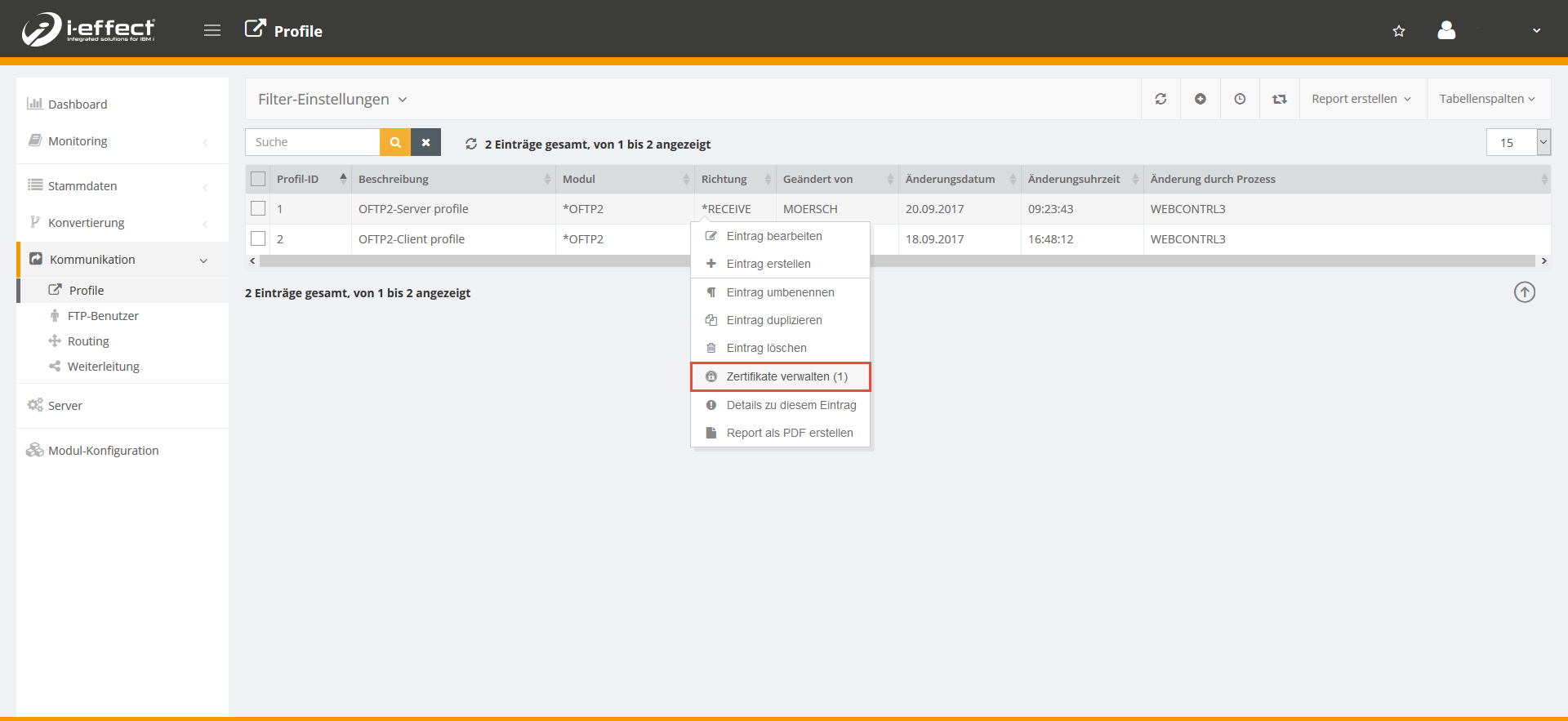 Rufen Sie den Menüpunkt Kommunikation → Profile auf. Rechtsklicken Sie auf das entsprechende Serverprofil und wählen Sie im Kontextmenü Zertifikate verwalten aus.