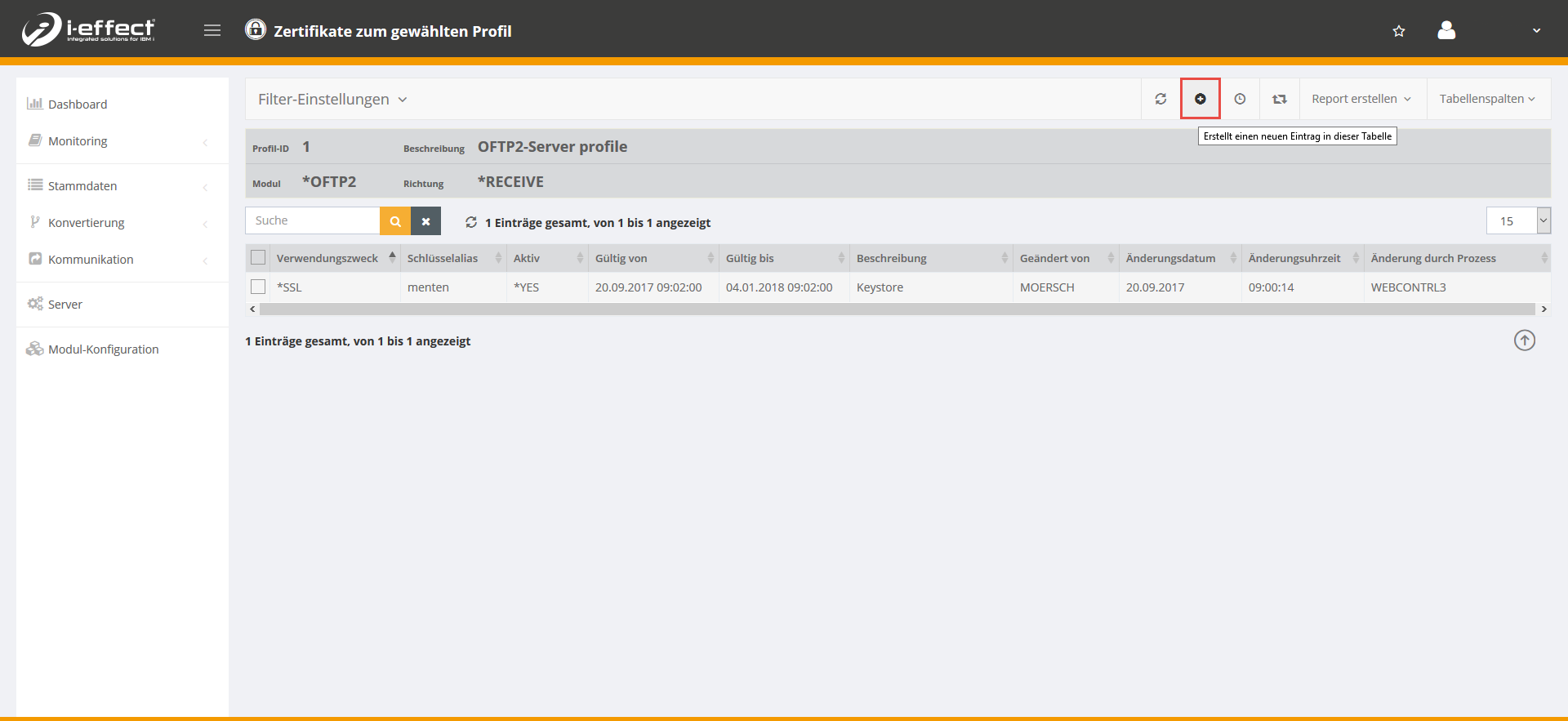 Schritt 1 - Eintragen des Keystores in der Zertifikatsverwaltung (für OFTP *RECEIVE)