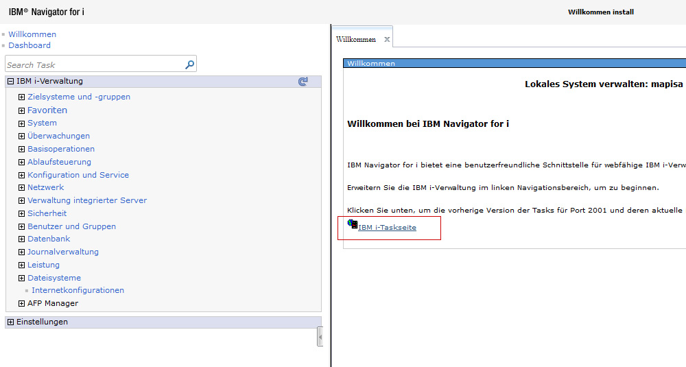 Öffnen Sie den IBM Navigator for i unter http://<SERVERNAME>:2001 und klicken sie auf den Link "IBM i-Taskseite".